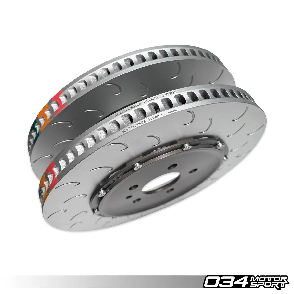 The central hat portion of the 034Motorsport rotor is made of 6061-T6 aircraft specification aluminum. The disc is constructed out of a proprietary metal alloy that can withstand immense braking temperatures while holding form. From the factory, the same straight-vaned rotor is used on both rear axles of the C8 RS6 & RS7. 034Motorsport rotors utilize 72 directionally curved vanes to forcefully flow cool air through the rotor to dissipate heat and are unique to the left and right axles to provide a substantial increase in cooling efficiency over the factory rotor design.